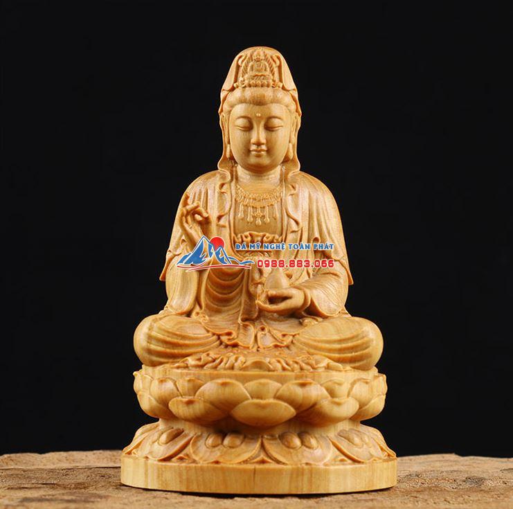 Tượng Phật Bà Quan Âm bằng gỗ nổi bật với hình ảnh Phật Bà tay phải cầm nhành liễu, tay trái cầm bình nước cam lộ để cứu độ chúng sinh nơi biển khổ trần gian đã trở thành hình ảnh quen thuộc với mỗi người Phật tử chúng ta.